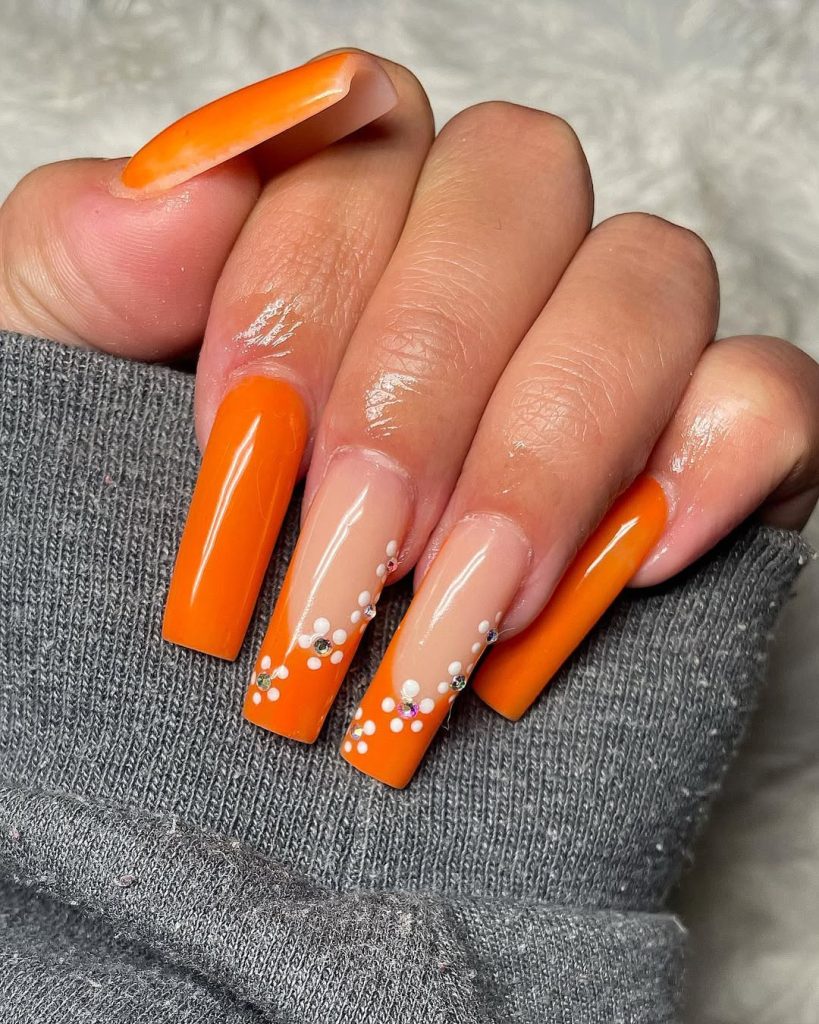 Bold color doesn’t have to mean complicated, and this look proves it. The vibrant orange brings instant energy, while the clean nude base and subtle embellishments keep things grounded. It feels confident and modern but still very wearable—like a favorite lipstick that instantly lifts your mood.