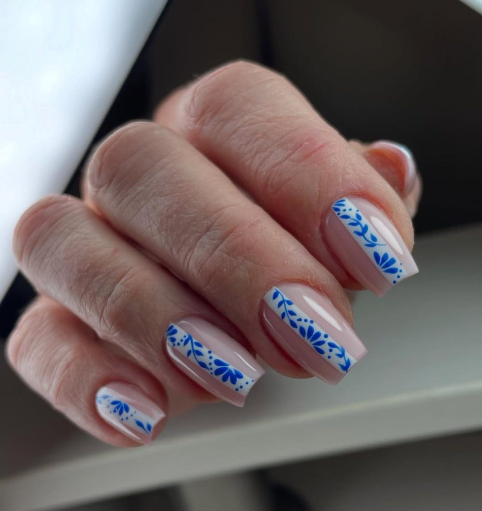 This design has a calm, airy elegance that feels perfect for spring mornings. The nude base blends seamlessly with the natural nail, while the blue and white florals bring a soft, almost watercolor-like charm. It feels light, thoughtful, and beautifully balanced.