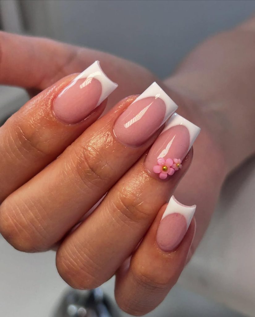 This look has a gentle, timeless charm. The crisp French tips feel classic and clean, while the soft pink flower accent adds a romantic spring touch. It feels familiar in the best way, with just enough detail to make it feel new again.