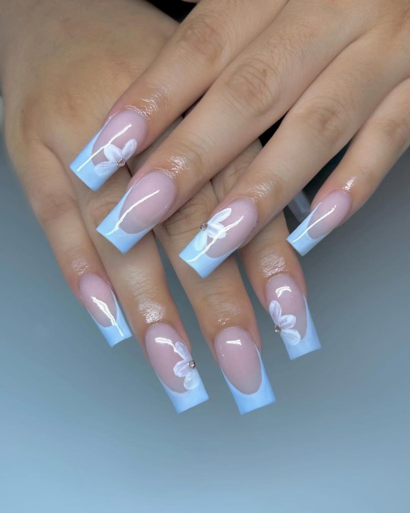 This look feels fresh, crisp, and effortlessly elegant. The clean white French tips create a classic base, while the soft blue floral art adds a breezy, spring-inspired detail. It has a relaxed sophistication that works with both casual and formal outfits.