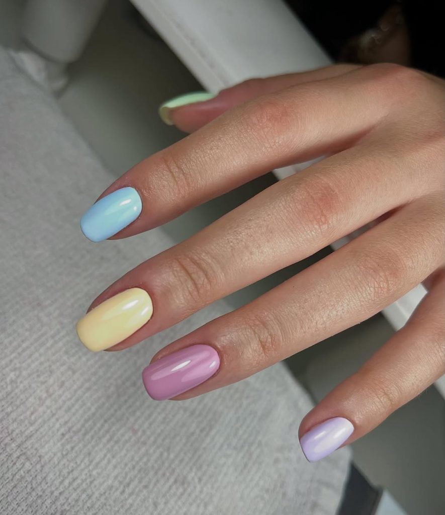 There’s something instantly uplifting about this look. Each nail is painted in a different pastel shade—soft blue, creamy yellow, gentle pink, and pale lilac—creating a playful but crisp spring palette. It feels cheerful and modern, yet still calm and wearable, perfect for everyday life.