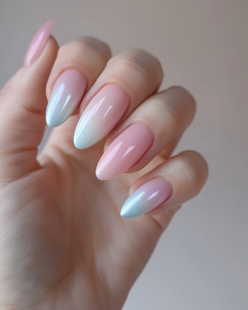 This design feels calm, airy, and incredibly feminine. The gentle blend of pink into a cool pastel tip creates a soft ombre effect that’s soothing and timeless. It’s the kind of manicure that looks beautiful in any light and pairs effortlessly with cozy knits or spring dresses.