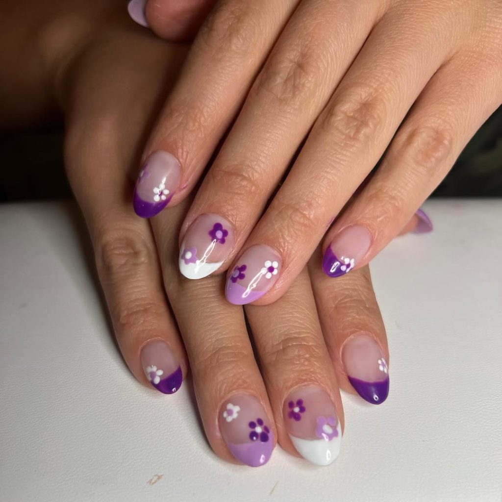 Soft, sweet, and a little playful, this manicure feels like spring in full bloom. The lilac French tips add a delicate pop of color, while the tiny floral accents bring charm and personality. It’s feminine without being overly adorable and has a calm, comforting vibe.