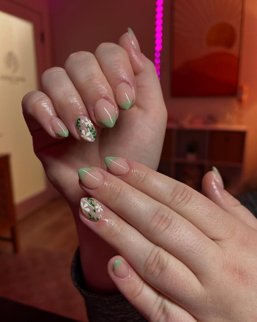 There’s something calm and grounding about this design. The soft nude base paired with muted green tips feels clean and modern, while the delicate floral accent adds personality without stealing the spotlight. It’s the kind of manicure that feels quietly confident and very grown-up.