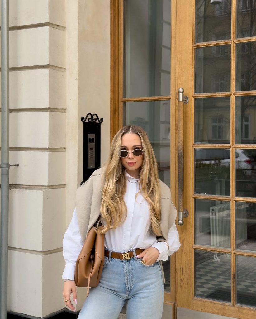 A crisp white shirt paired with denim delivers a clean, confident look that always feels appropriate and current.