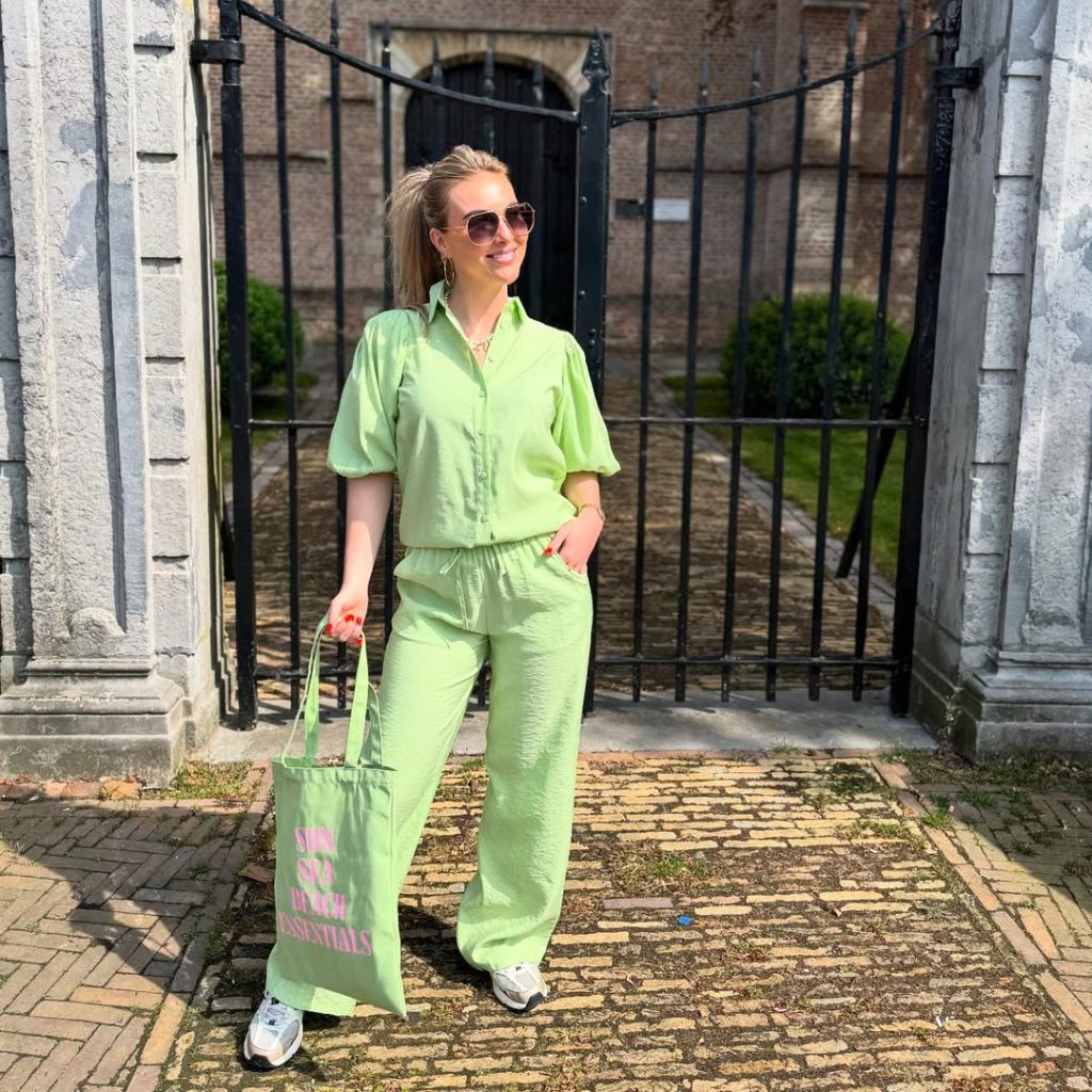 A coordinated set in a soft green shade delivers comfort, cohesion, and effortless spring style.