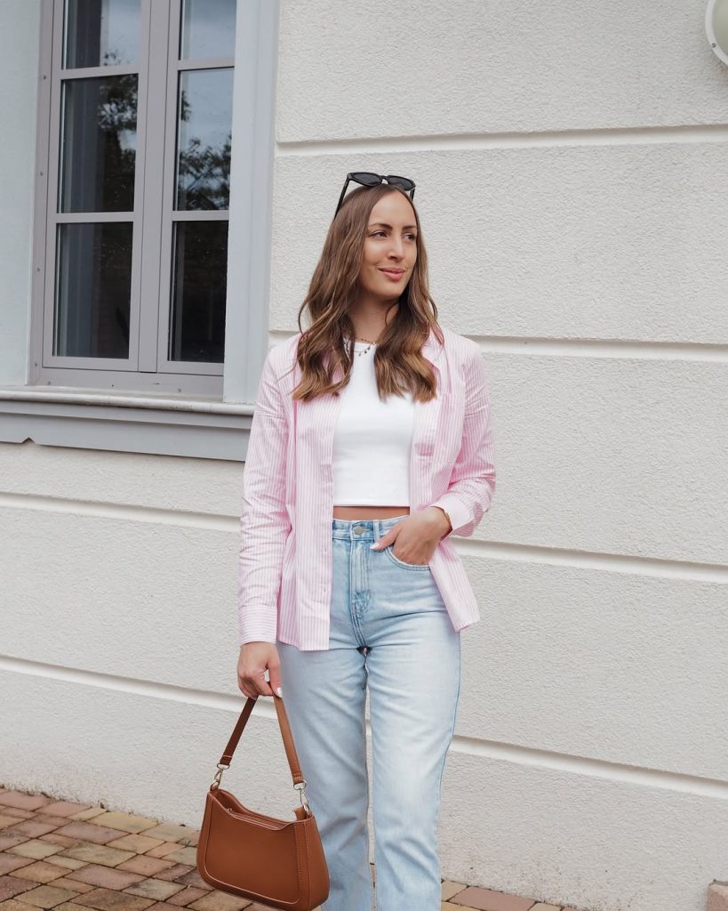 - Pink striped button-down shirt, oversized