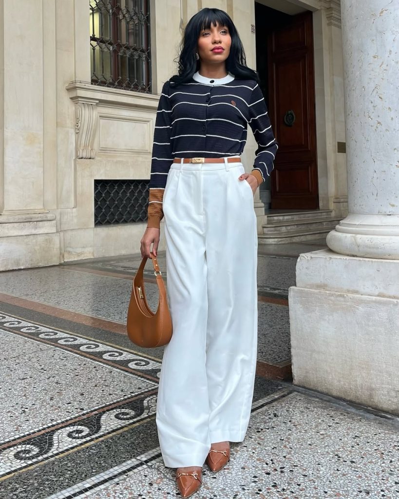 This outfit suits cultural city spring breaks, museum days, or elegant lunches in Miami or historic districts abroad. Add pearl earrings or a sleek low bun for subtle sophistication. Avoid heavy layering—this look shines in its simplicity. A timeless inspiration choice that travels well beyond 2026.