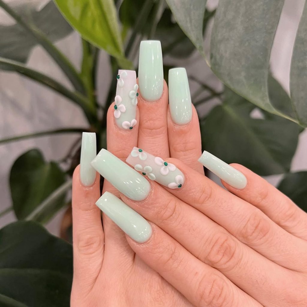There’s something instantly calming about this soft mint look. It feels fresh in that quiet, confident way—not loud, not trying too hard. The delicate flowers add a gentle, almost nostalgic spring mood, like the first warm afternoon after a long winter. It’s pretty without being precious, and it has that clean, polished finish that always looks intentional.