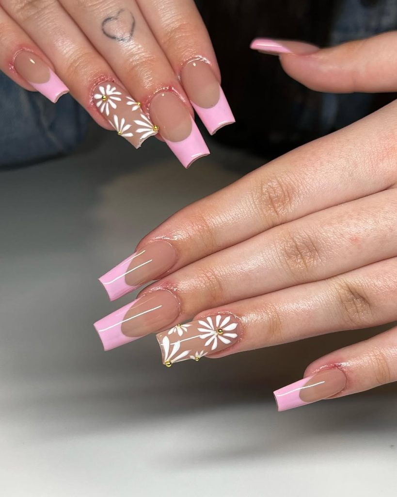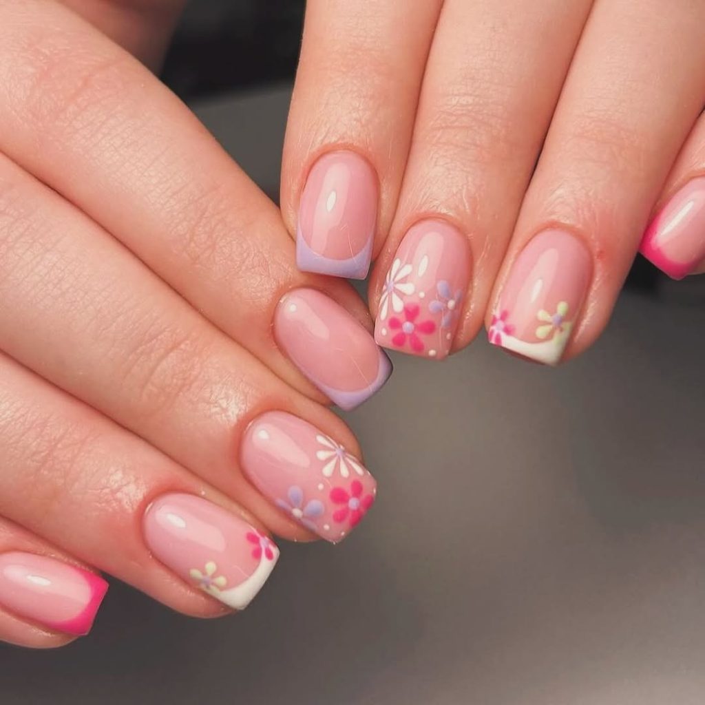 These nails feel effortlessly cheerful. A soft pink base combined with miniature blossoms and cheerful color tips exudes a carefree feminine vibe that we all appreciate, and maybe a touch of mischief too. It’s the kind of nail art that brings a smile to your face when you notice it dancing in the sun.
