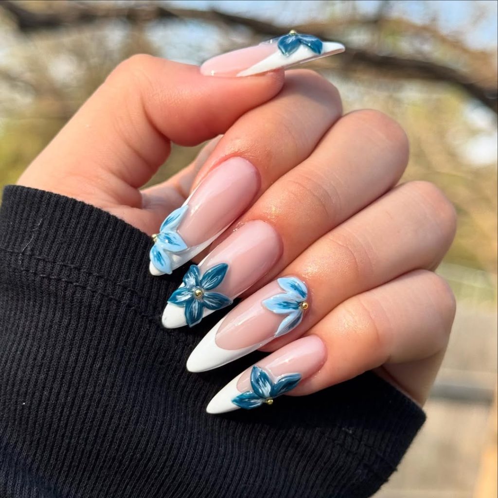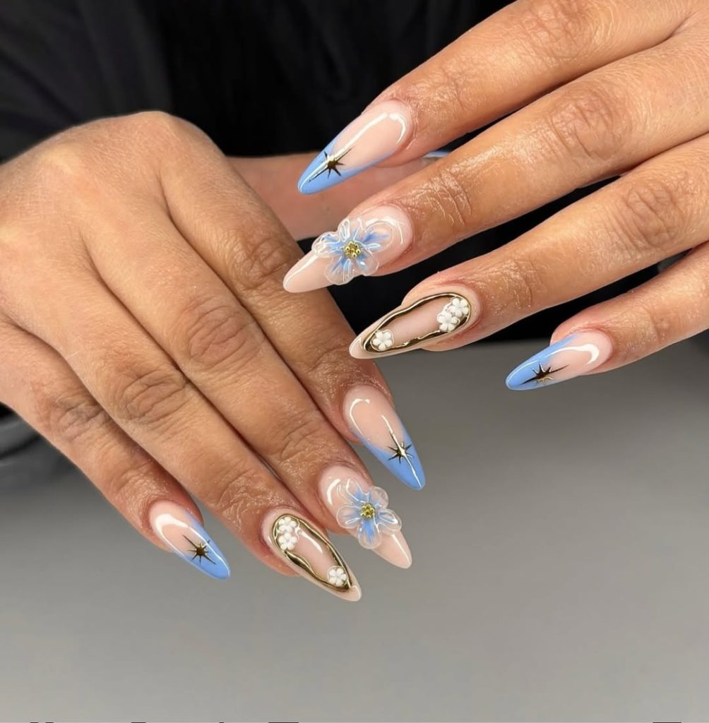 These nails feel refined and artistic, with just the right amount of drama. Cool blue accents, delicate flowers, and subtle gold details elevate the soft nude base, capturing the light beautifully. It’s elegant but not stiff—modern, feminine, and very spring-forward.