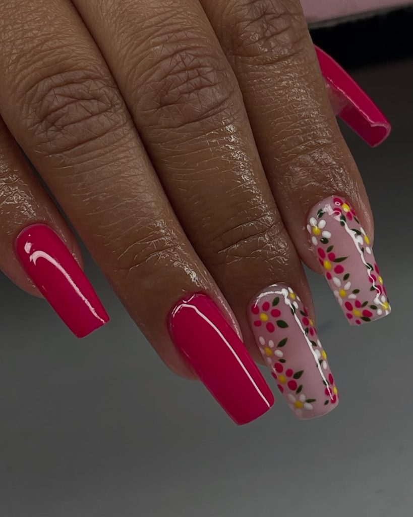 What makes the design stand out is the contrast. This look is slightly different with flowers than softer looks for the spring. It also feels a bit more fashion-forward and edgy while still seasonal. This look works best with an almond or coffin shape. If you are looking for unique and memorable ideas for 2026, this look is perfect.