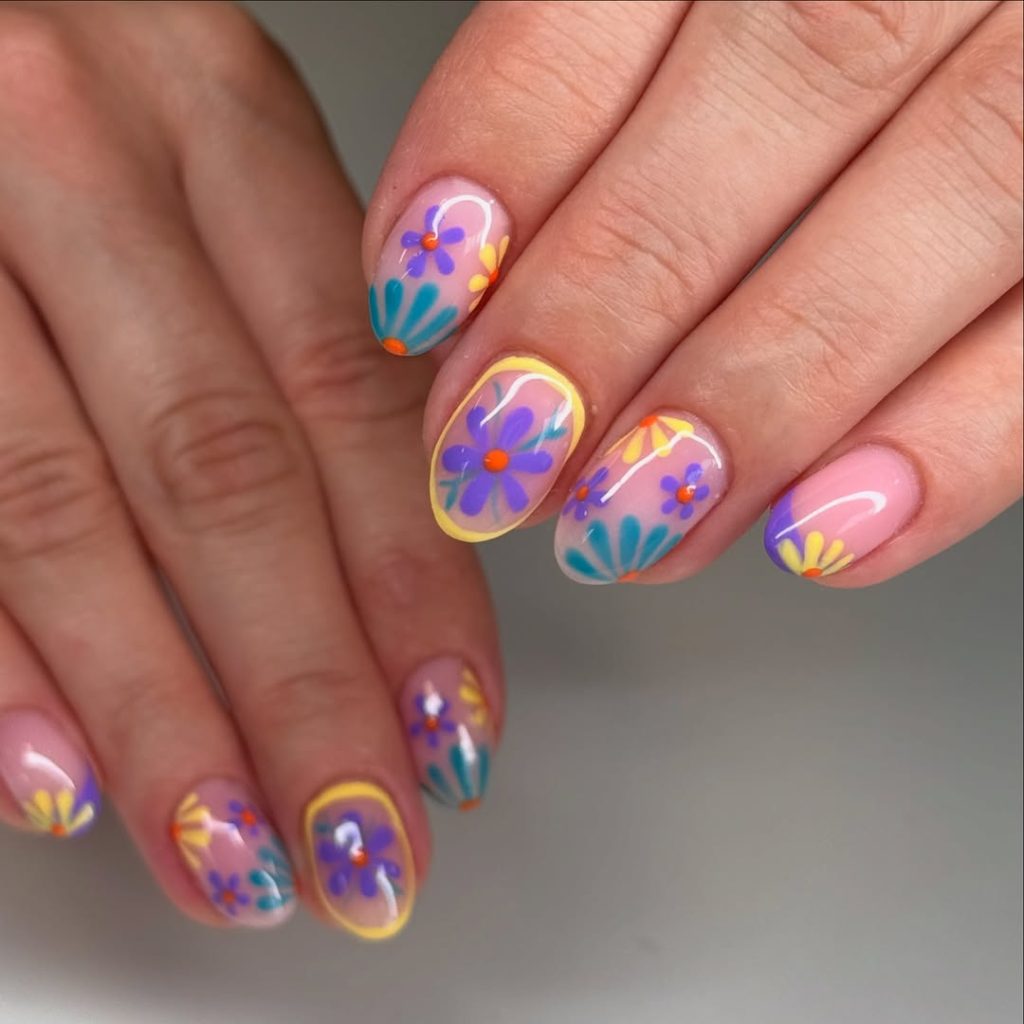 The design is light and delicate. The sheer nude base is clean and airy, and the flowers are small, colorful scattered spring confetti. The quiet design is thoughtful, and the manicure is easy and effortless.