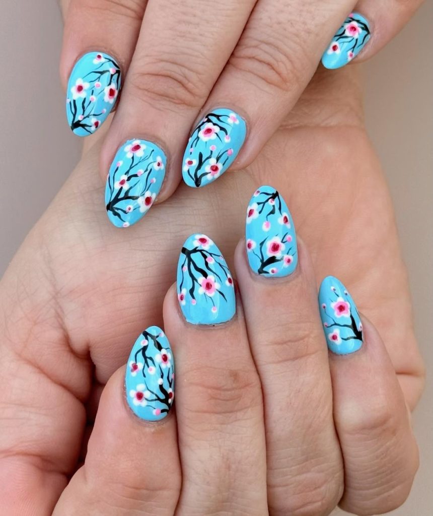 There’s a calm, almost poetic mood to these nails. A soft blue background paired with delicate floral branches feels serene and thoughtful, like early spring blossoms against a clear sky. It’s gentle, hand-painted, pretty, and charming. The design feels personal and not merely trendy.