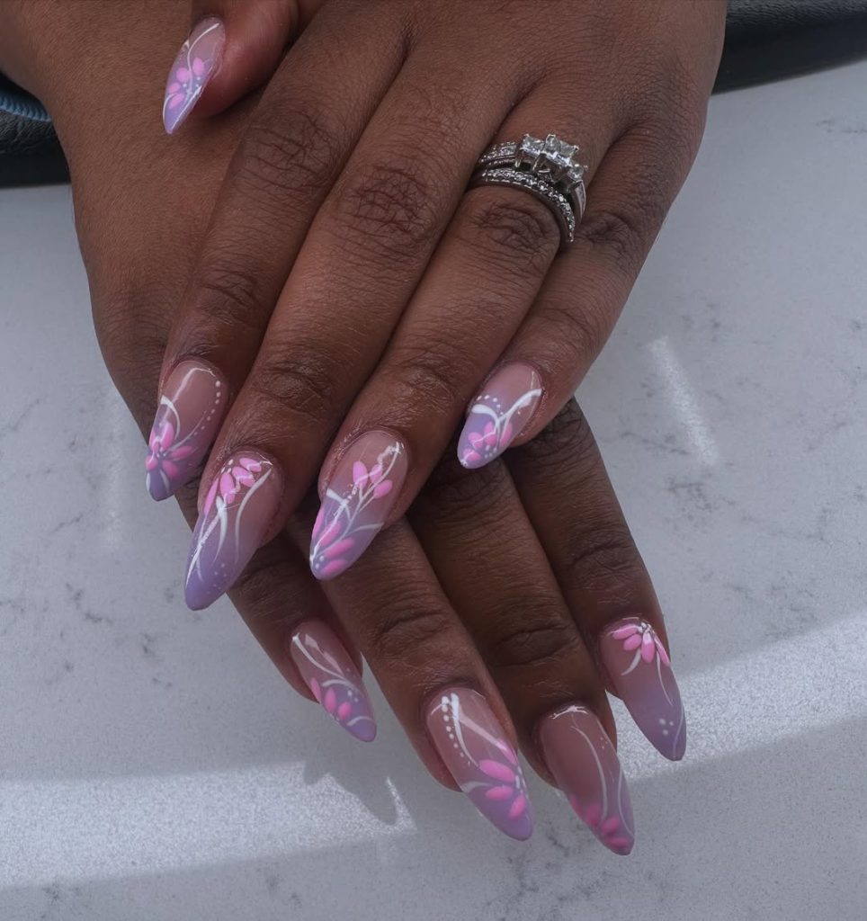 This manicure gives off romantic and quietly expressive vibes. The soft purple tones and delicate floral lines create a look that is feminine yet not too sweet, leaving a feeling of calm confidence, polish, and thoughtfulness.
