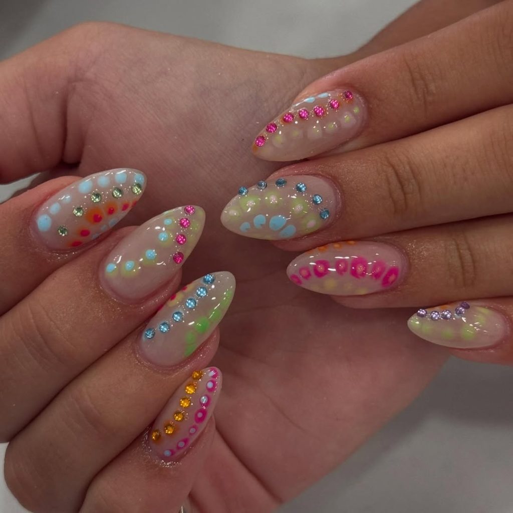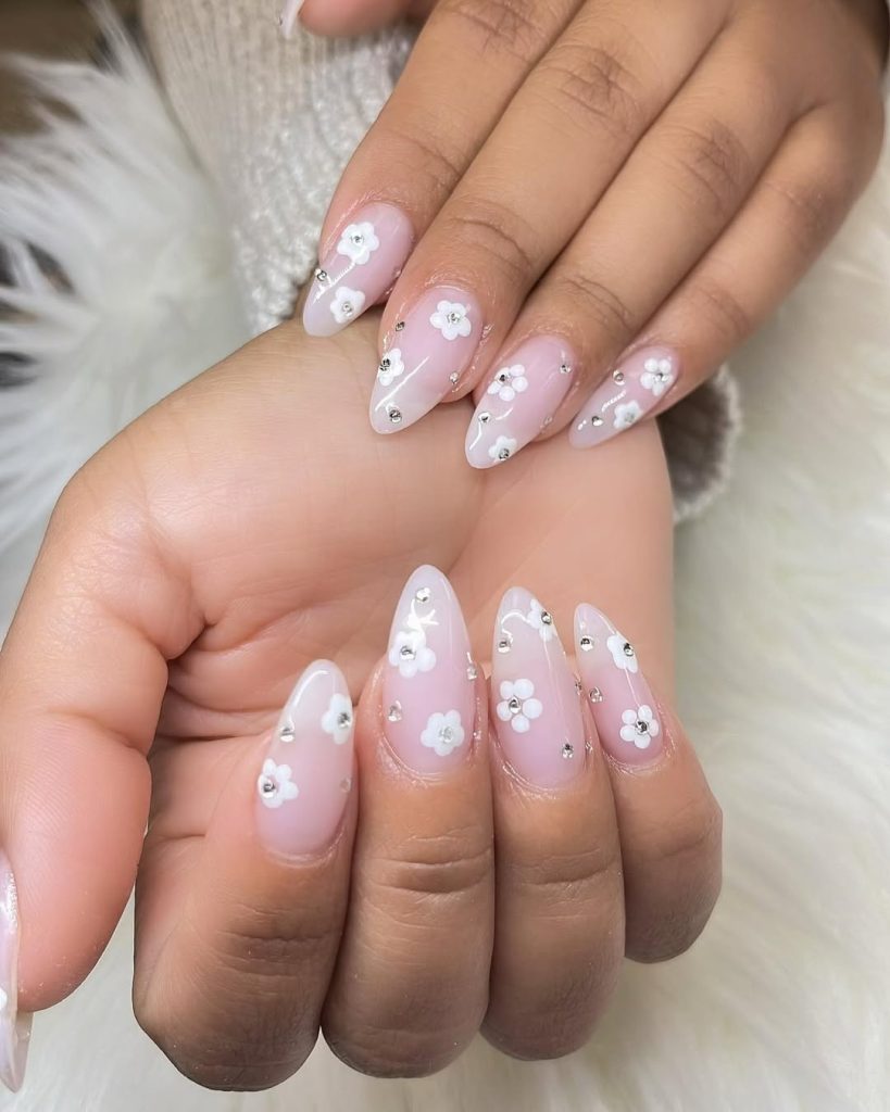This design can serve as a powerful motivator to try something different. Almond nails provide a sleek base for embellishments, and the overall design is balanced and lovely. It’s a wonderful and fun way to celebrate spring and bring a little joy for the start of 2026.