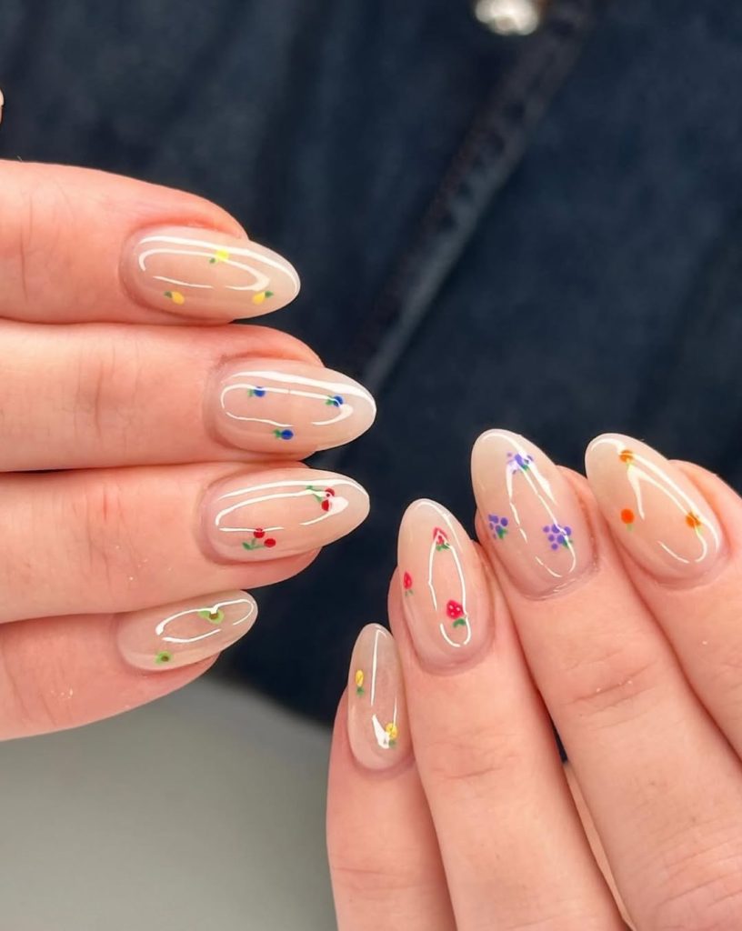 Joyful and expressive in their design and creation, these nails have a warm and carefree feeling about them, like a denim jacket on a warm day, certain to instantly change your mood. The design feels artistic and handcrafted, like a warm spring day, exciting to dreamy summertime, full of personal, playful detailing, and expressive stories. The brighter flowers on top of the nude canvas create a stark contrast, and the almond-shaped nails help the flower design breathe.