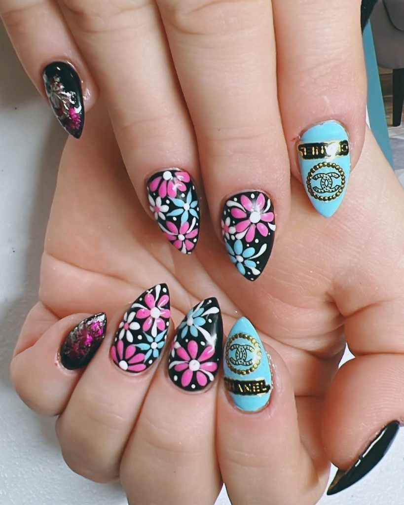 The nails are dramatic and have an artistic edge to them. The black nails create a base and some depth, while the flowers contrast with the black and create a personality. It’s bold, expressive, and unapologetically confident. This look look is perfect for someone who is passionate about nails and wants them to be a style statement.