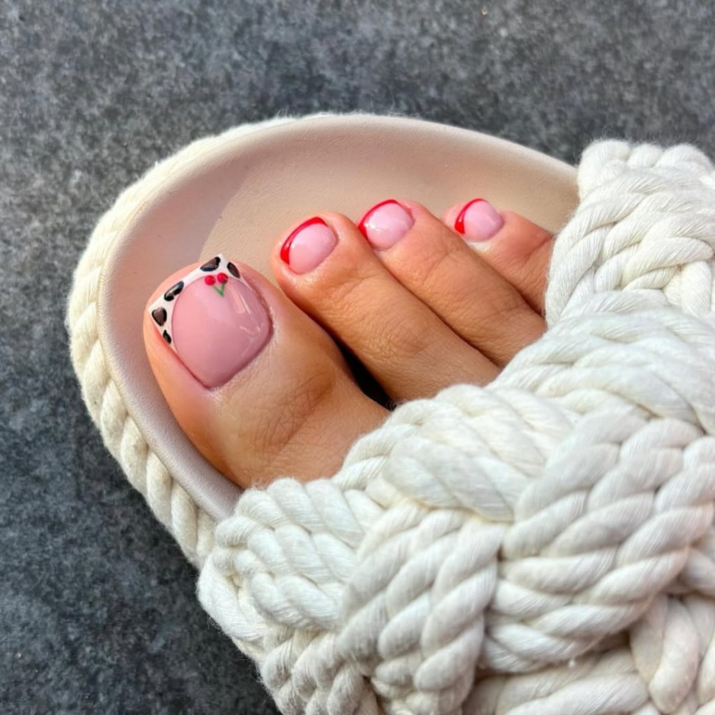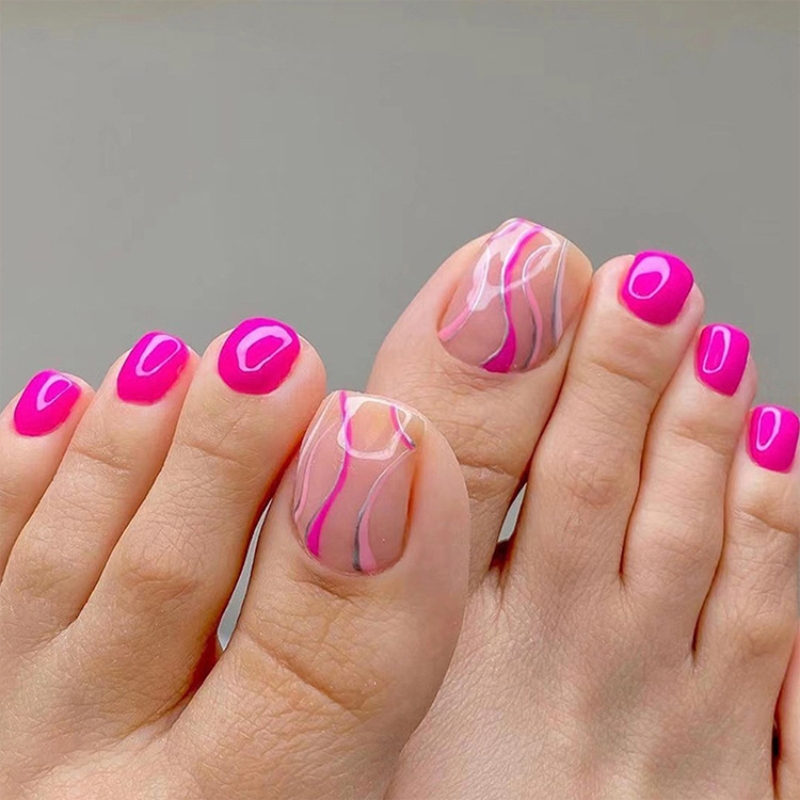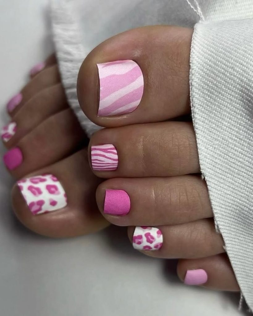 This pedicure feels fearless and fashion-forward. The vibrant pink base paired with zebra-inspired patterns brings instant attitude, like slipping into your favorite statement jacket. It’s playful, confident, and unapologetically bold, giving spring toenails a strong personality that stands out without feeling chaotic. This design speaks to women who enjoy expressing themselves through color and art.