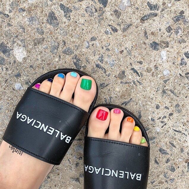 This yellow pedicure instantly feels like bottled sunshine. It exudes a cheerful, energetic, and irresistible vibe, yet maintains a sense of intentionality and style without being overly extravagant. The small black accent adds a modern edge that keeps the look grounded, making it feel fresh instead of childish. These colorful pedicures capture that first true spring feeling when everything suddenly looks brighter and you’re ready to lean into something a little bolder than usual.