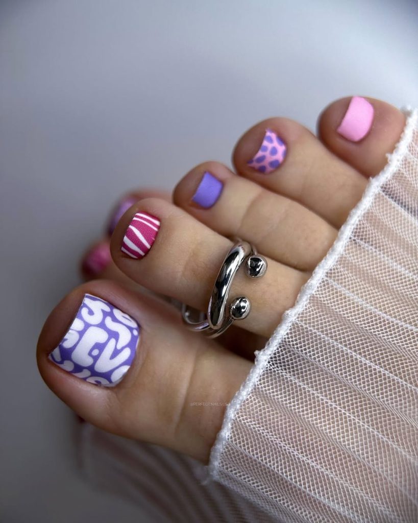 This pedicure feels artistic, modern, and quietly bold. The mix of pastel purple and pink with abstract patterns creates a soft yet striking visual effect. It feels creative but calm, offering a fresh take on spring toenails that goes beyond traditional florals or solids.