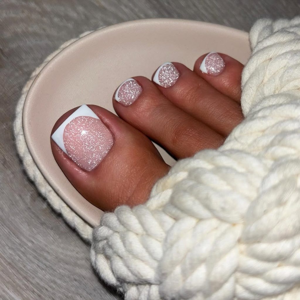 26. Soft Pink Glitter French Pedicure with White Tips