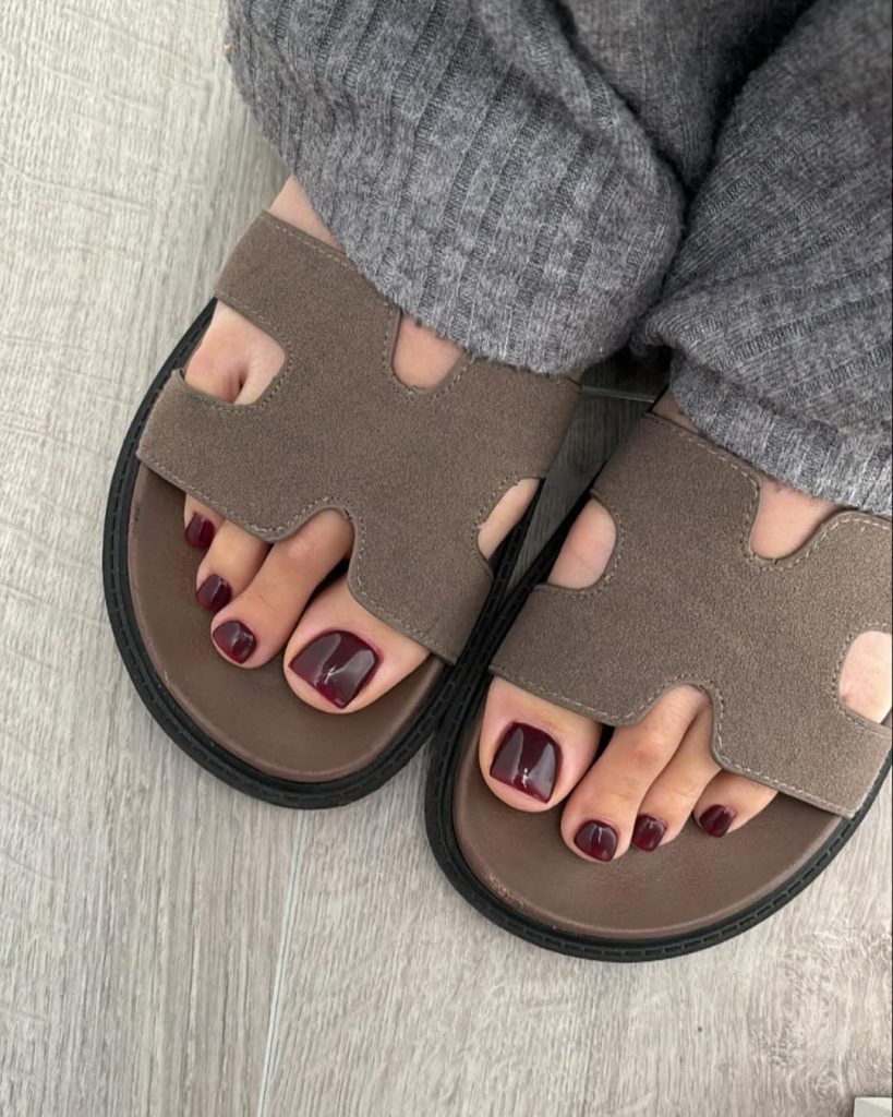 This deep burgundy shade exudes a subtle elegance that remains timeless. It feels rich, polished, and incredibly grown-up—the kind of toenail color that whispers confidence rather than shouting for attention. This look feels timeless, like a favorite lipstick you always come back to, making it a reliable choice for spring when you want something refined but not boring.