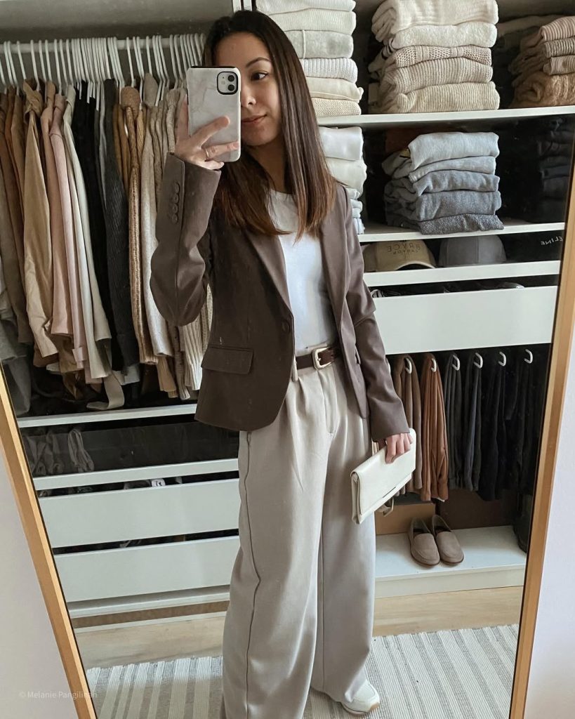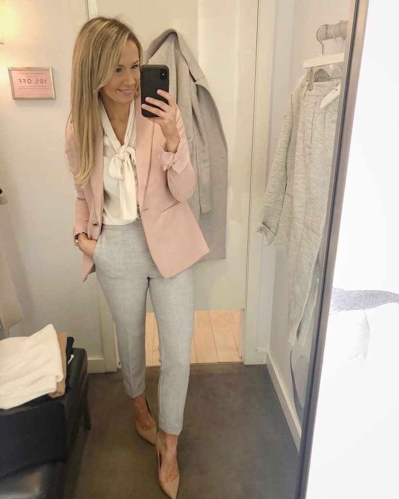 For the early spring chill, a blush blazer teamed with tailored trousers gives a work-chic business casual feel.