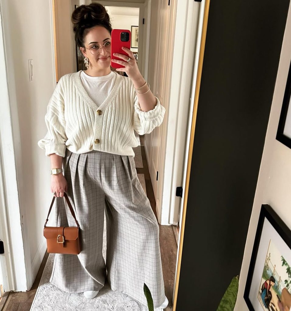 For women in spring 2026, a ribbed cardigan with wide-leg trousers offers office-chic business casual comfort while keeping a polished look.