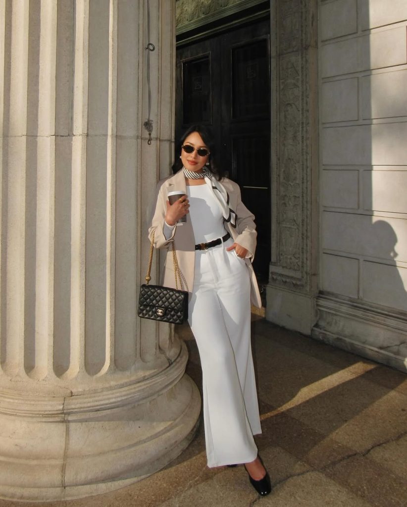 With a neutral blazer layered over crisp white separates, you’ll exude European ease and confidence with timeless office chic.