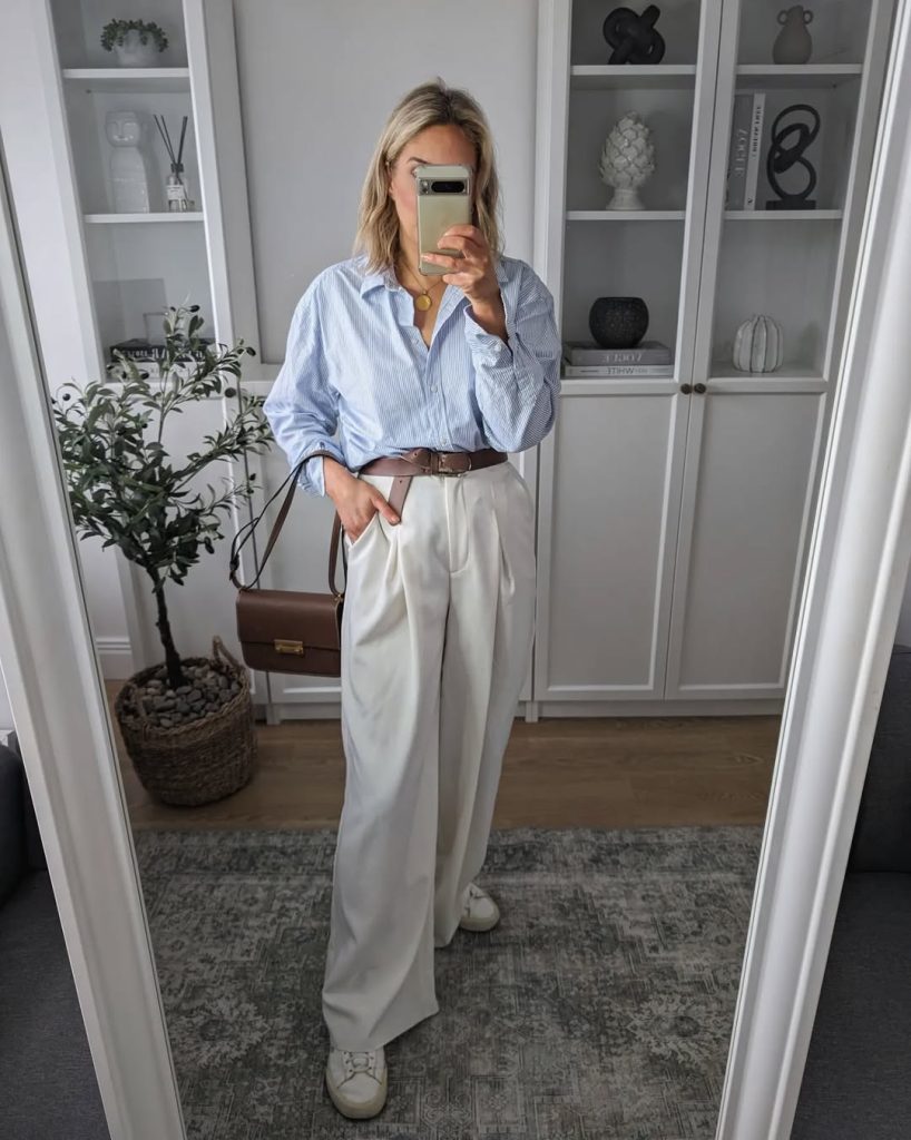 This look is ideal for bright office days, casual meetings, or transitional weather. Add warmth with subtle gold jewelry or a nude shoe. Avoid dark accessories here—the beauty of this outfit lies in its soft palette and fresh women’s ideas of 2026 appeal.