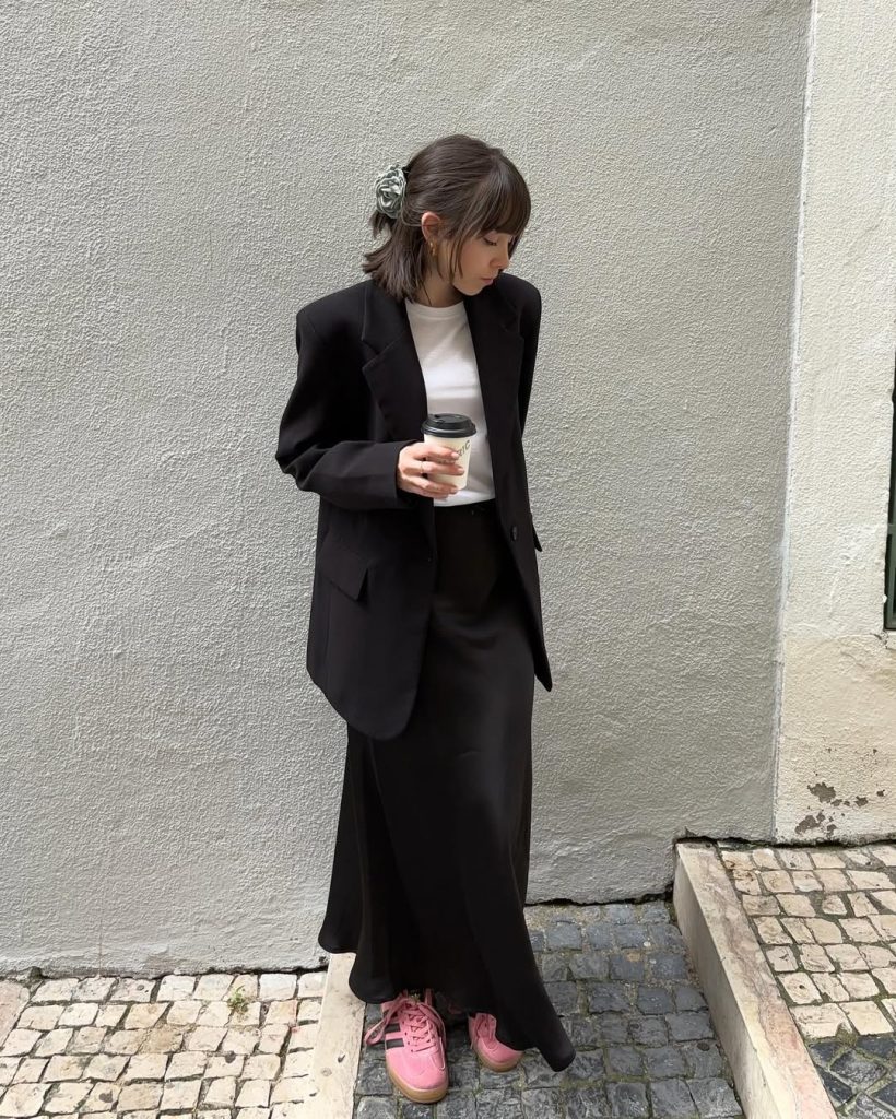 This look suits creative offices, casual meetings, or fashion-forward workplaces. Add a structured bag to sharpen the silhouette. Avoid high heels—the sneakers are what give this outfit its charming, contemporary balance and align with evolving 2026 trends.