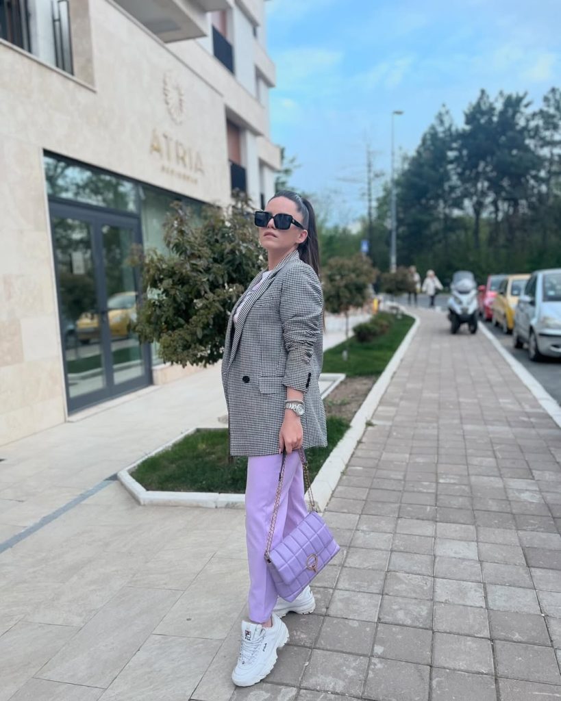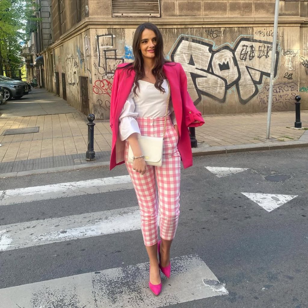 A checked blazer styled with pastel trousers delivers a bright, confident take on office-chic business casual.