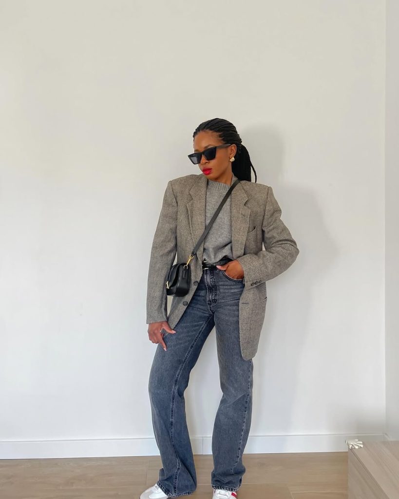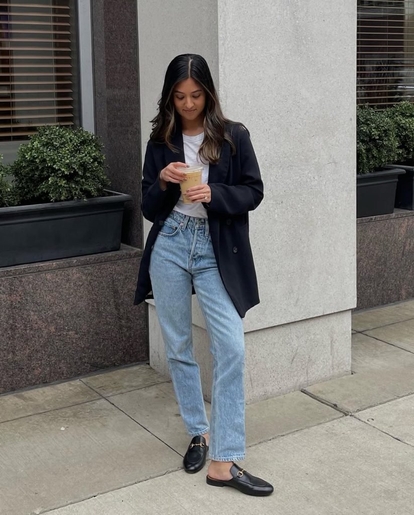 A softly oversized blazer layered over classic denim creates an office-chic business casual look that feels modern, confident, and quietly powerful.
