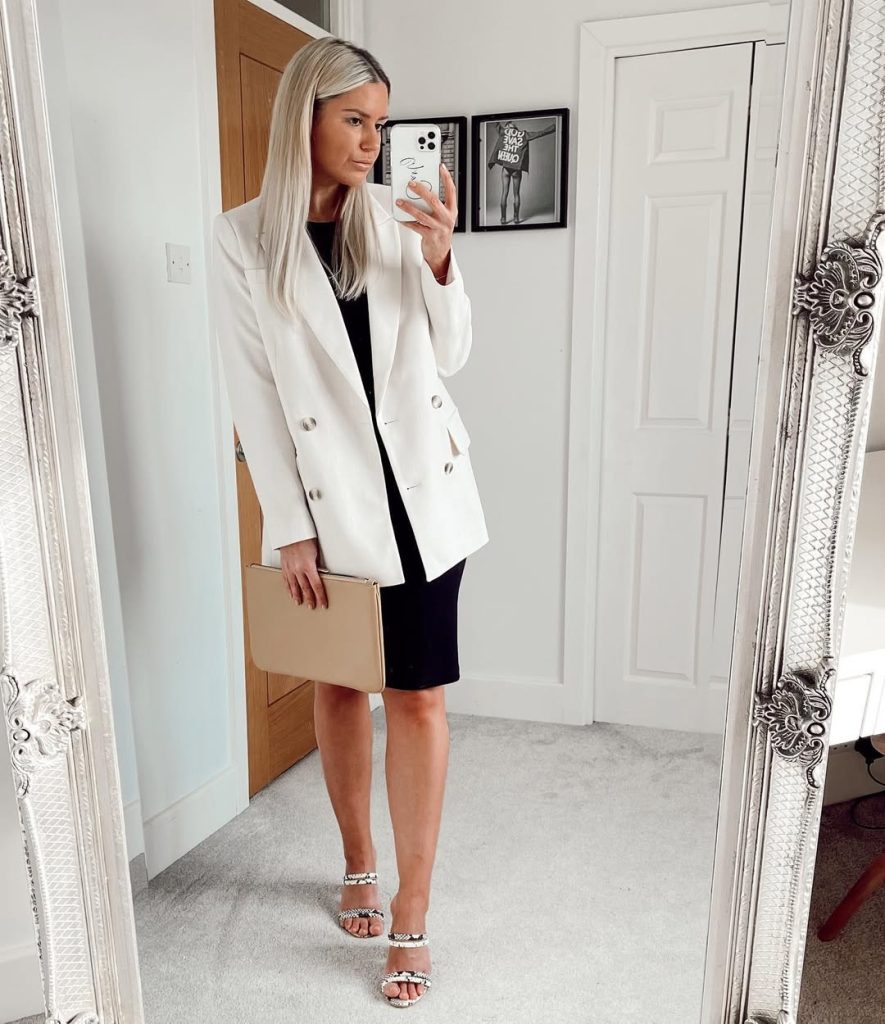 A white double-breasted blazer over a black sheath dress defines professional elegance with sharp contrast and timeless appeal.
