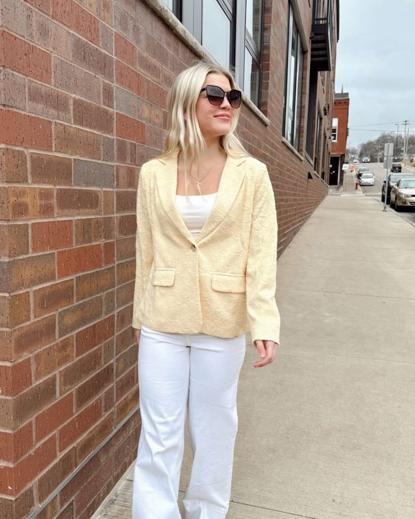 A textured cream blazer paired with crisp white trousers creates a light, optimistic take on office-chic business casual for spring 2026.
