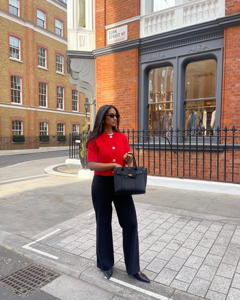 A bold red knit top styled with black trousers delivers timeless professional confidence with a modern city feel.