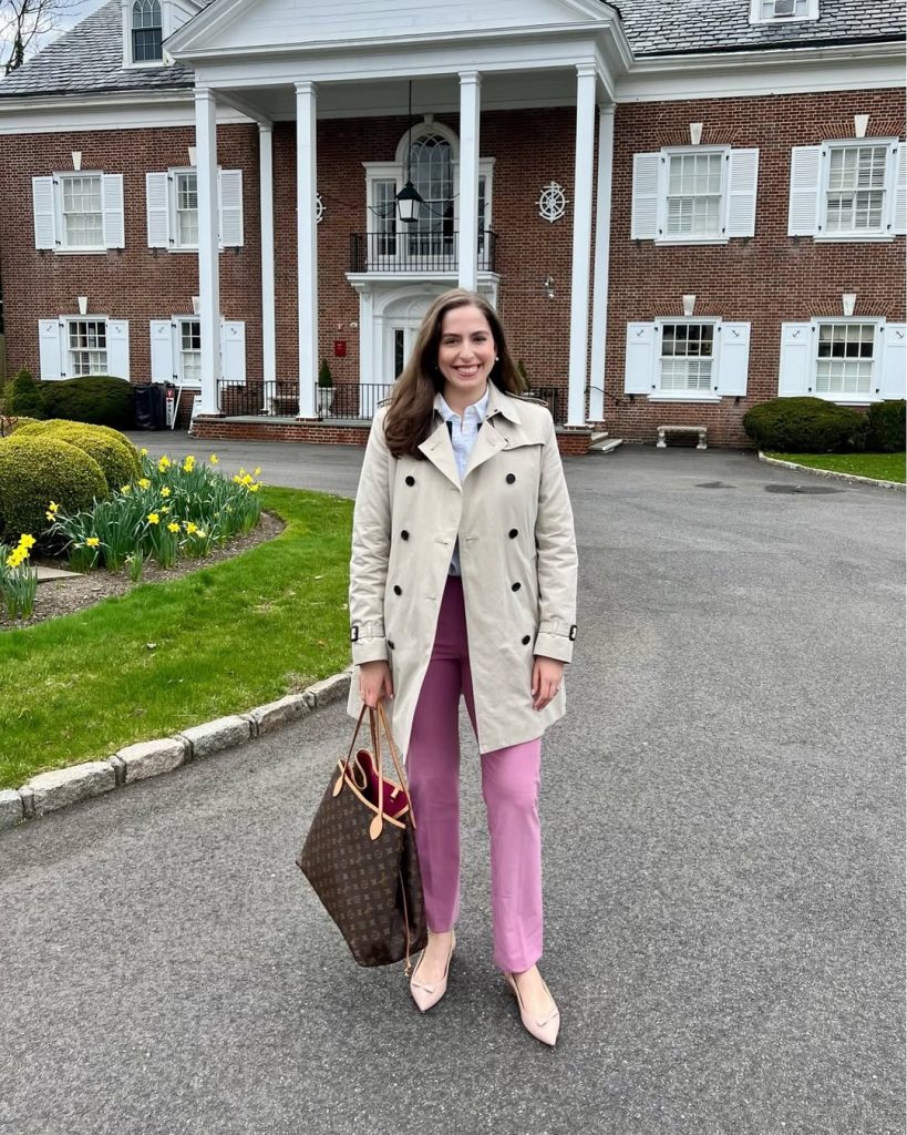 Early spring is the perfect time to layer a classic trench coat over pastel trousers for a polished women’s office wear look.