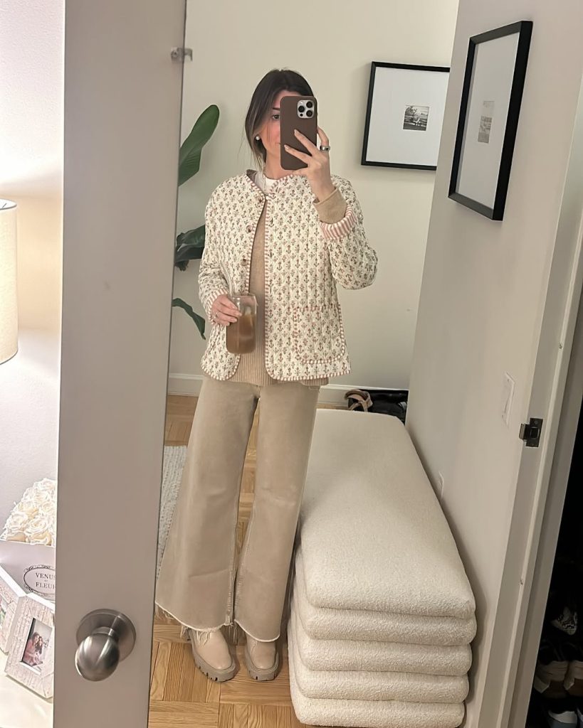 A patterned quilted jacket styled with neutral separates offers relaxed business casual comfort with personality.