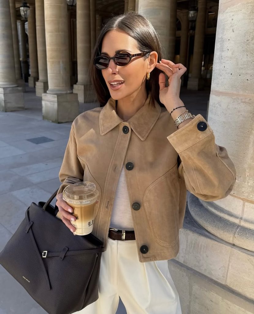 A suede jacket paired with creamy trousers delivers effortless office chic with European influence.