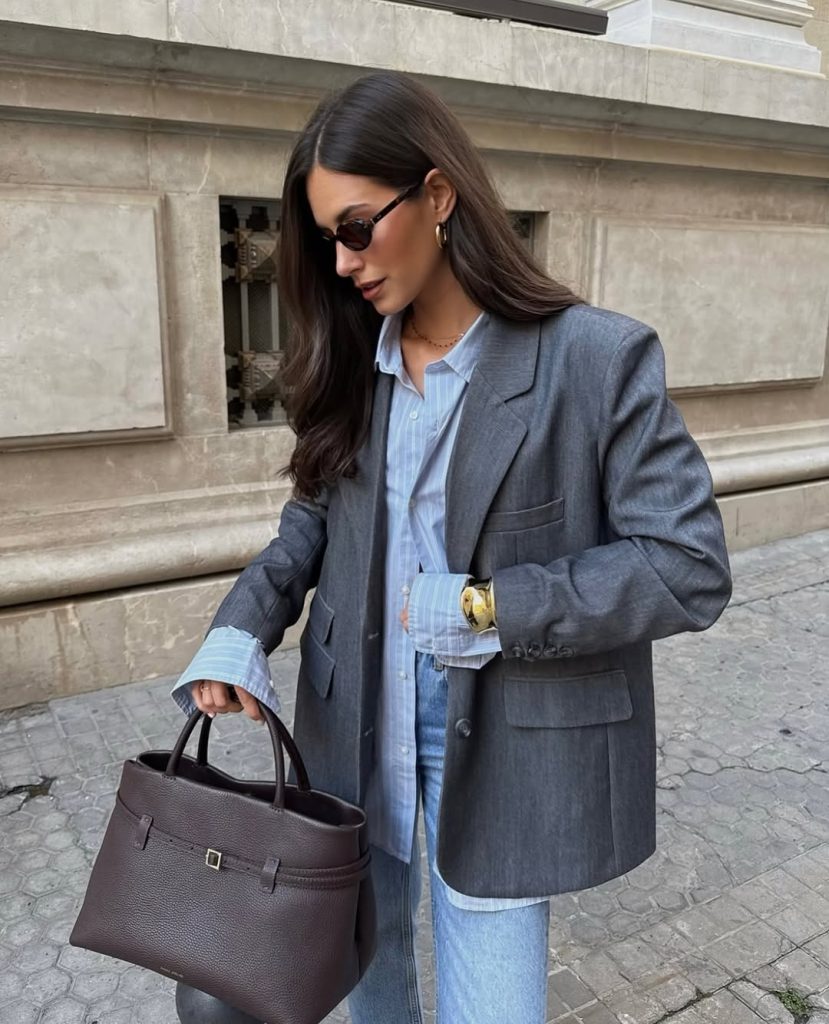 - The featured items include a light blue oversized wool blazer, a striped cotton poplin button-down shirt, straight-leg light wash jeans, a structured leather tote bag in the Birkin style, gold minimal hoop earrings, and dark slim sunglasses.