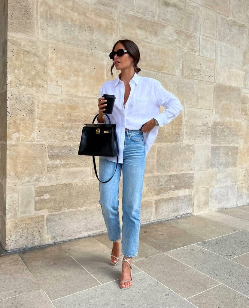 - Featured items include a white oversized button-down shirt made of cotton or linen, light blue straight high-waisted jeans, neutral strappy heels, a black leather structured top-handle bag, and black minimal sunglasses, along with gold or silver jewelry.
