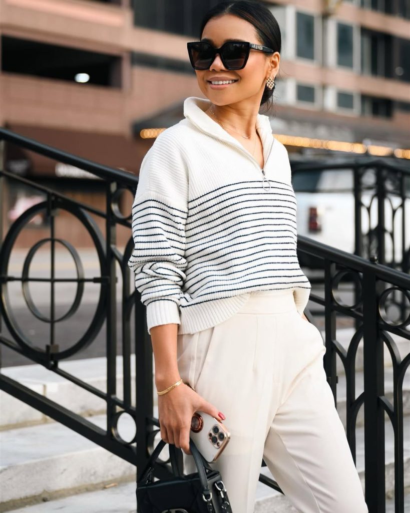 In spring’s transition, a relaxed smart casual style is achieved with a woman’s look consisting of the perfect pairing of tailored cream trousers and a knit with stripes