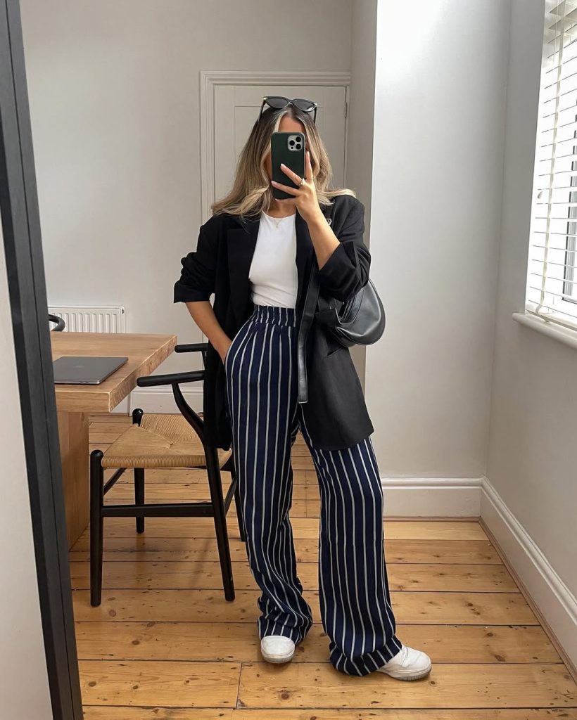 With the comfort-first trousers, business casual is redefined by pairing a blazer with wide-leg striped trousers and taking the tailored approach.