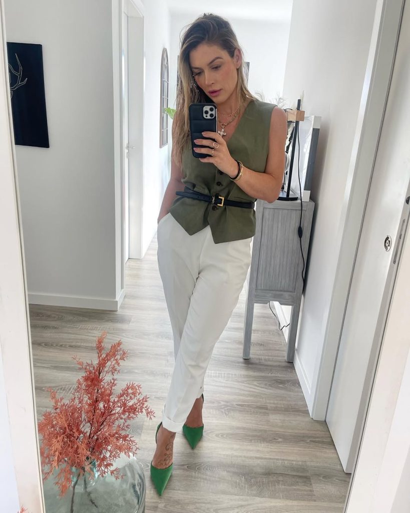 A tailored vest in olive green paired with white trousers offers a fresh take on office-chic business casual color combos for spring.