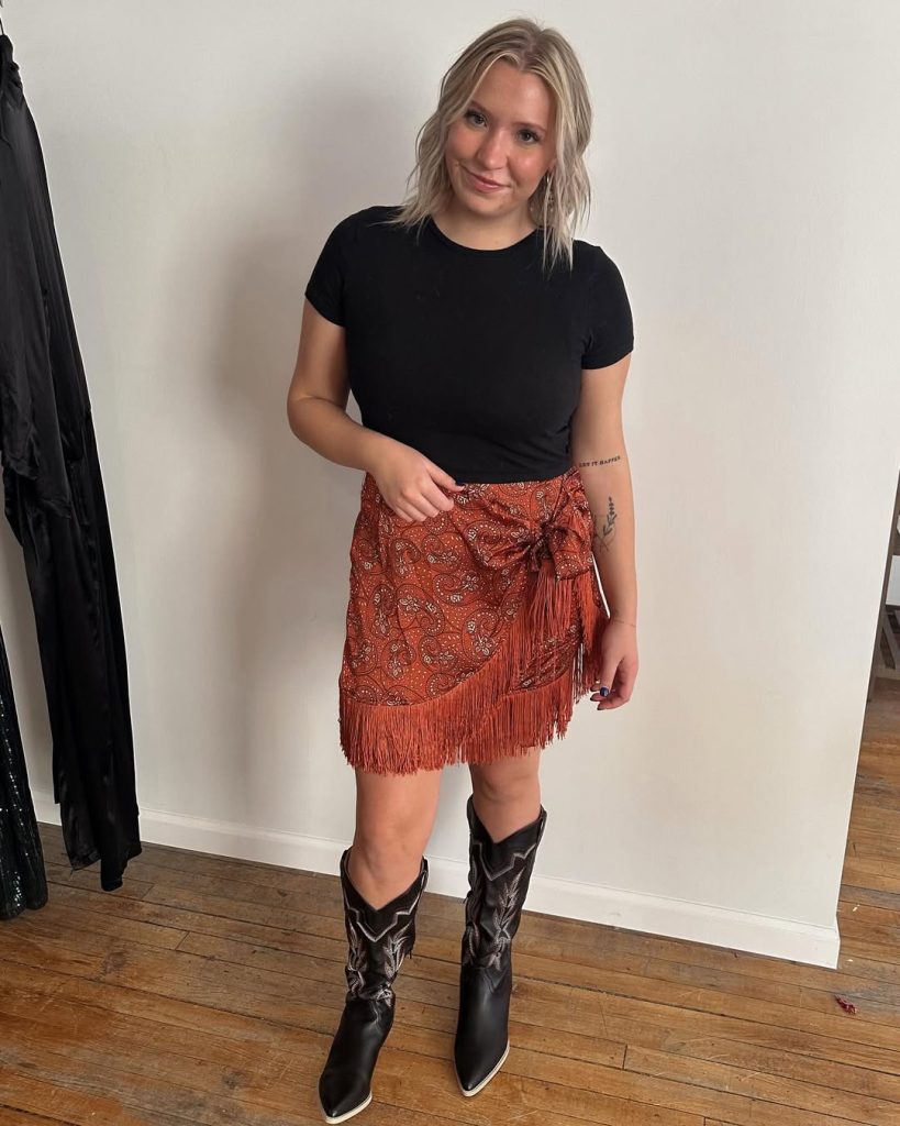 A fringed skirt with a sleek crop top channels confident night concert energy with a playful western edge.