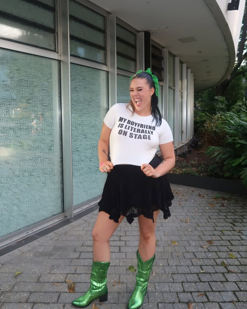 This outfit feels joyful and expressive—exactly the kind of style that shines at lively pop concerts or outdoor festivals. The statement tee adds humor and personality, while the green boots make the outfit unforgettable.