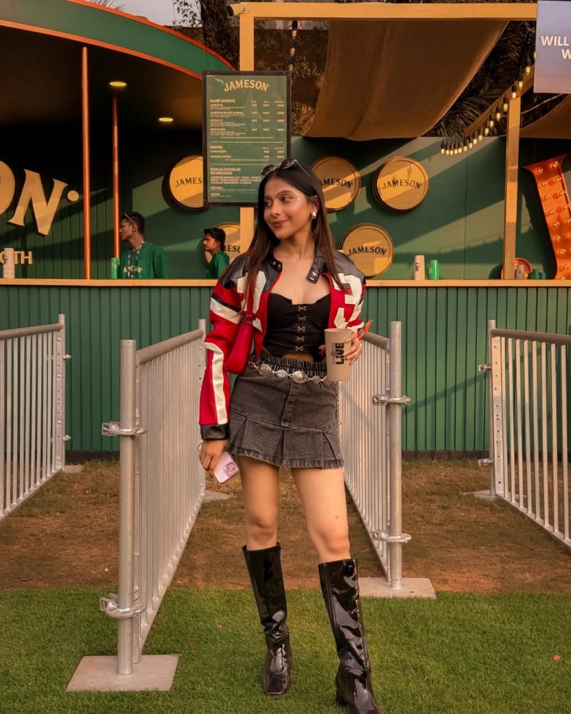 This look blends street style with festival energy. The moto jacket adds personality and structure, while the mini skirt keeps the outfit light enough for hot outdoor concerts.