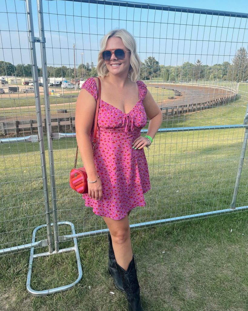 A vibrant pink dress paired with classic boots delivers playful country energy—a lively pick for summer concert outfit 2026 inspiration.