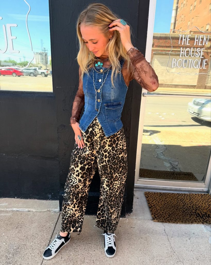 Leopard print pants and a denim vest create a fearless boho and western festival outfit perfect for outdoor concerts.